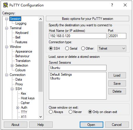 (1)打开putty服务器连接工具,填写服务器IP地址和端口号