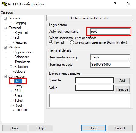 (2)点击putty左侧菜单Connection中的Data填写服务器用户名