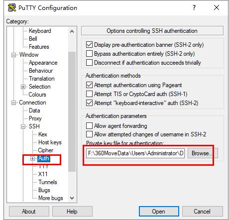 (3)点击putty左侧菜单 Connection中SSH中的Auth选择你通过PuTTYGen制作好的服务器PPK密钥文件